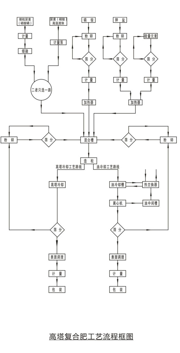 工藝原理固體尿素或硝銨(硝銨磷等)通過熔融器加熱熔融后成為熔融液,也可以直接使用蒸發(fā)濃縮后的液態(tài)尿液(硝銨)液中加入相應(yīng)的磷肥、鉀肥、填料及添加劑制成 混合料漿?;旌狭蠞{進入高塔造粒設(shè)備進行噴灑造粒,物料在從高塔下降過程中,與塔底上升氣流阻力相互作用,與其進行熱交換后降落到塔底,落入塔底的物料,經(jīng)篩分表面處理后得到顆粒復(fù)合肥。